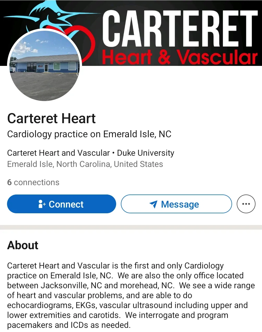 A LinkedIn page straight-up describes the business as the "first and only cardiology practice on Emerald Isle, NC" that "sees a wide range of heart and vascular problems, and are able to do echocardiograms, EKGs, vascular ultrasound including upper and lower extremities and carotids. We interrogate and program pacemakers and ICDs as needed."